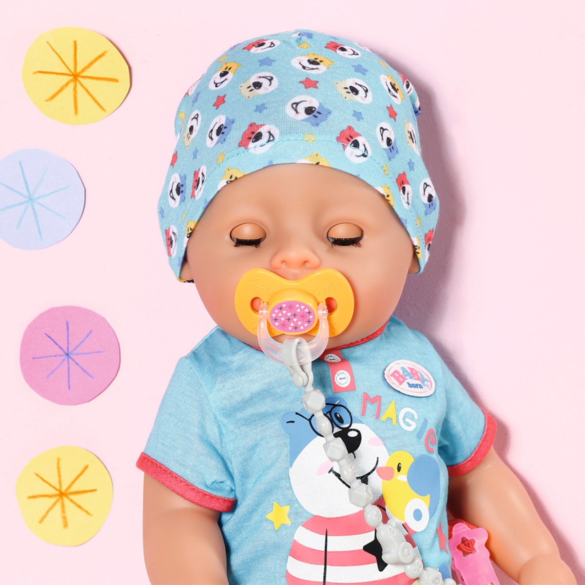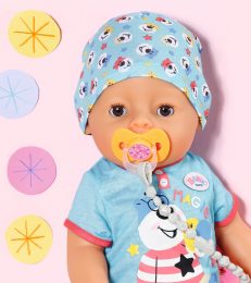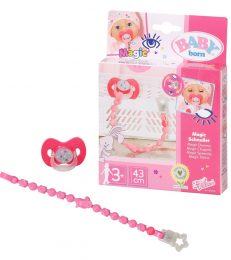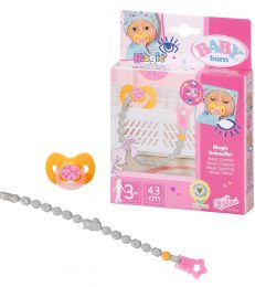 Щоб маленька лялечка BABY born не плакала, вам точно знадобиться пустушка! Яскрава, симпатична, на кліпсі та ланцюжку – вашому маляткові обов’язково сподобається! Функція ‘Чарівні очі’ (тільки для ляльок Magic): очі закриваються та відкриваються чарівним чином при повороті пустушки.