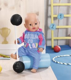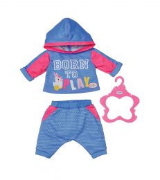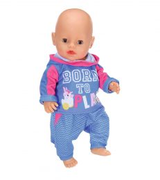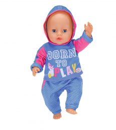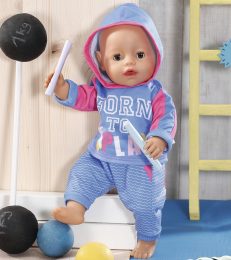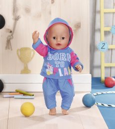 Малята BABY Вorn дуже жваві та полюбляють активний спосіб життя. Яскравий новий блакитний спортивний костюм для ляльки дозволить зробити ігри з нею ще яскравішими та веселішими! Штанці та кофтинка з капюшоном із милими малюнками та життєрадісними написами додадуть нових емоцій до ігор із лялькою.