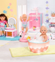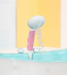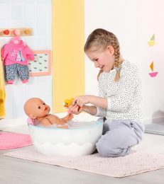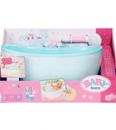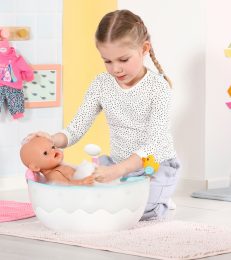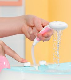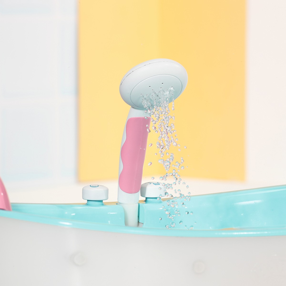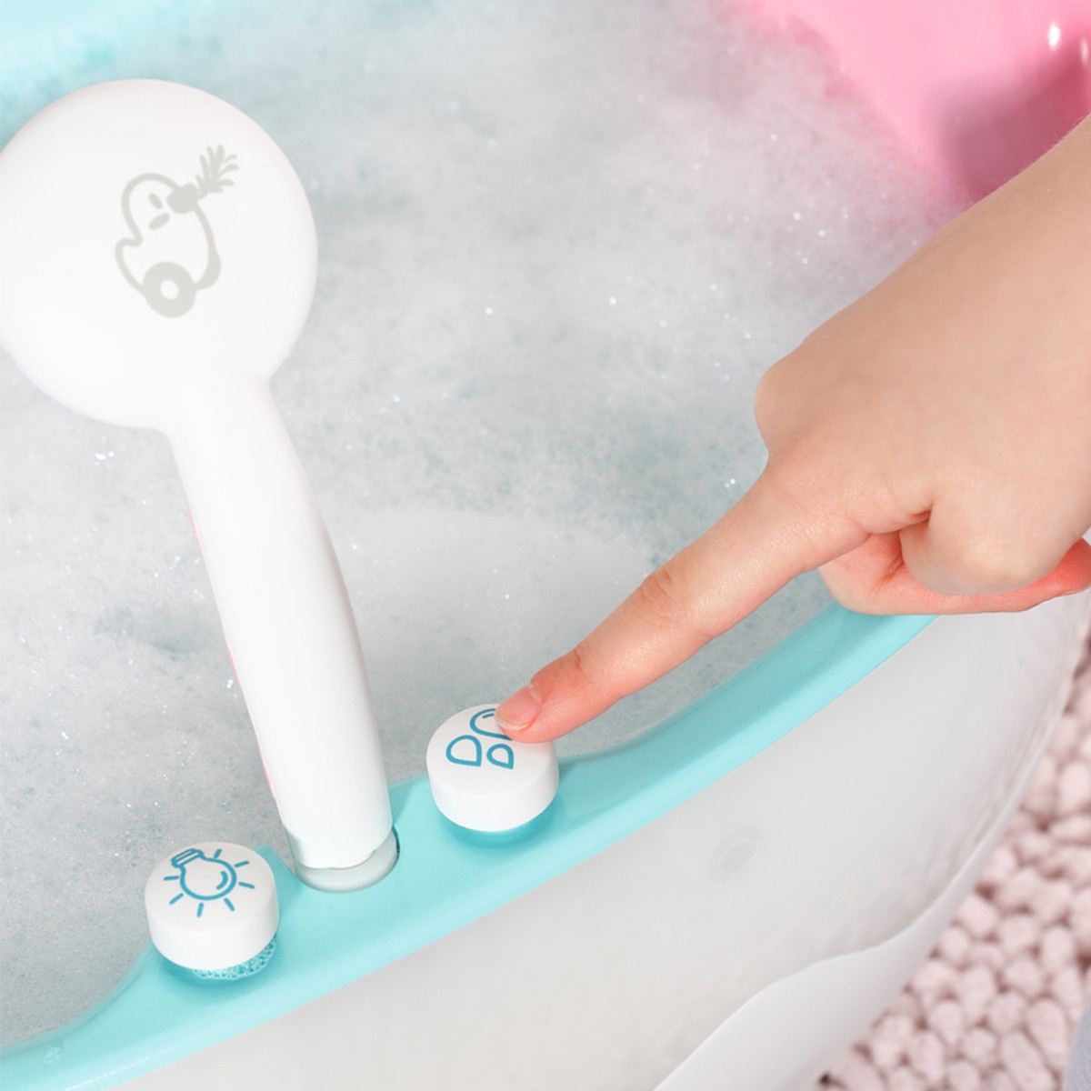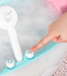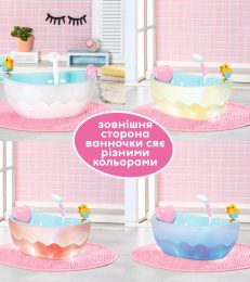 Ванночка всередині блакитного кольору та білого з хвилястим малюнком ззовні. Якщо натиснути на кнопку поруч з душем, зовнішня сторона ванночки сяє різними кольорами. Натисніть кнопку біля душу, щоб активувати його. Якщо ванна порожня, ви можете почути плескіт і звуки води.